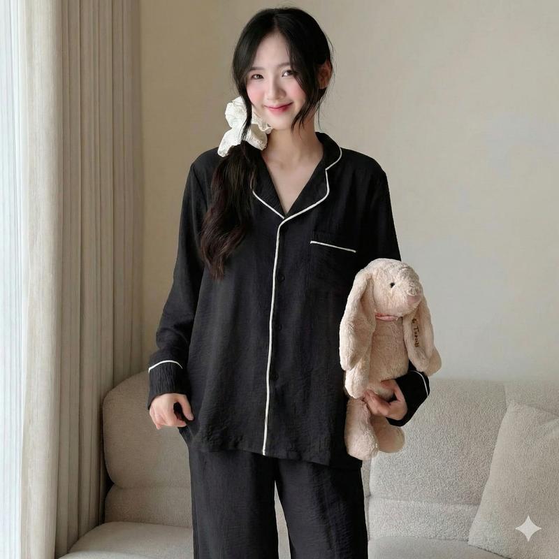 Thiết kế tinh tế: Kiểu dáng bộ dài tay – quần dài phối viền né sang trọng, cổ bẻ thanh lịch cùng hàng cúc trước chỉn chu.