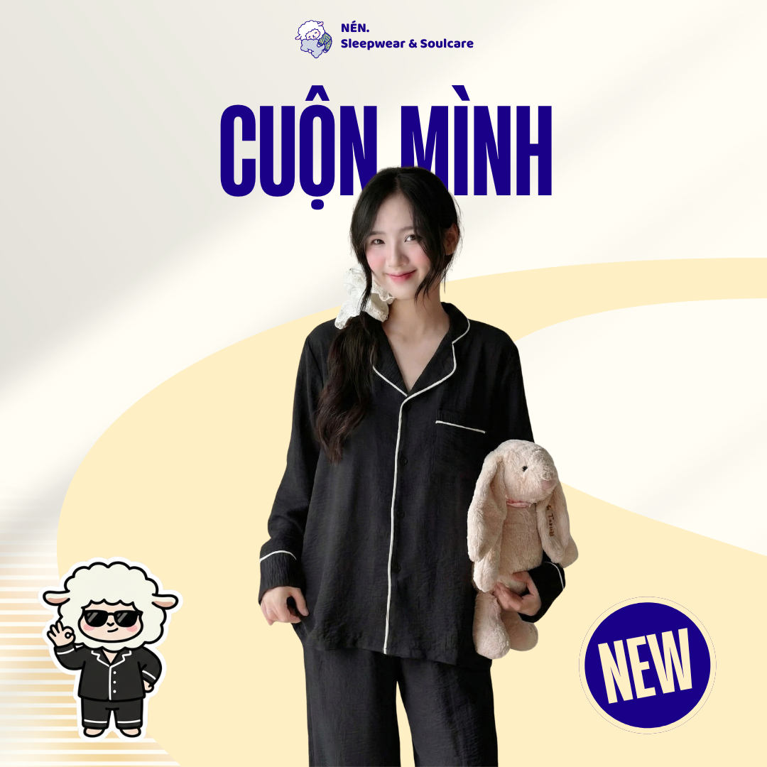Đúng như tên gọi, bộ Pijama Cuộn Mình thuộc BST Sleepwear của Nén – Sleepwear & Soul Care được ra đời để cùng bạn “ẩn mình” khỏi những ồn ào náo nhiệt. Với thiết kế dáng rộng phóng khoáng trên nền sắc Đen tối giản, sản phẩm mang đến một không gian riêng tư tuyệt đối, nơi cơ thể và tâm hồn bạn được thả lỏng hoàn toàn.